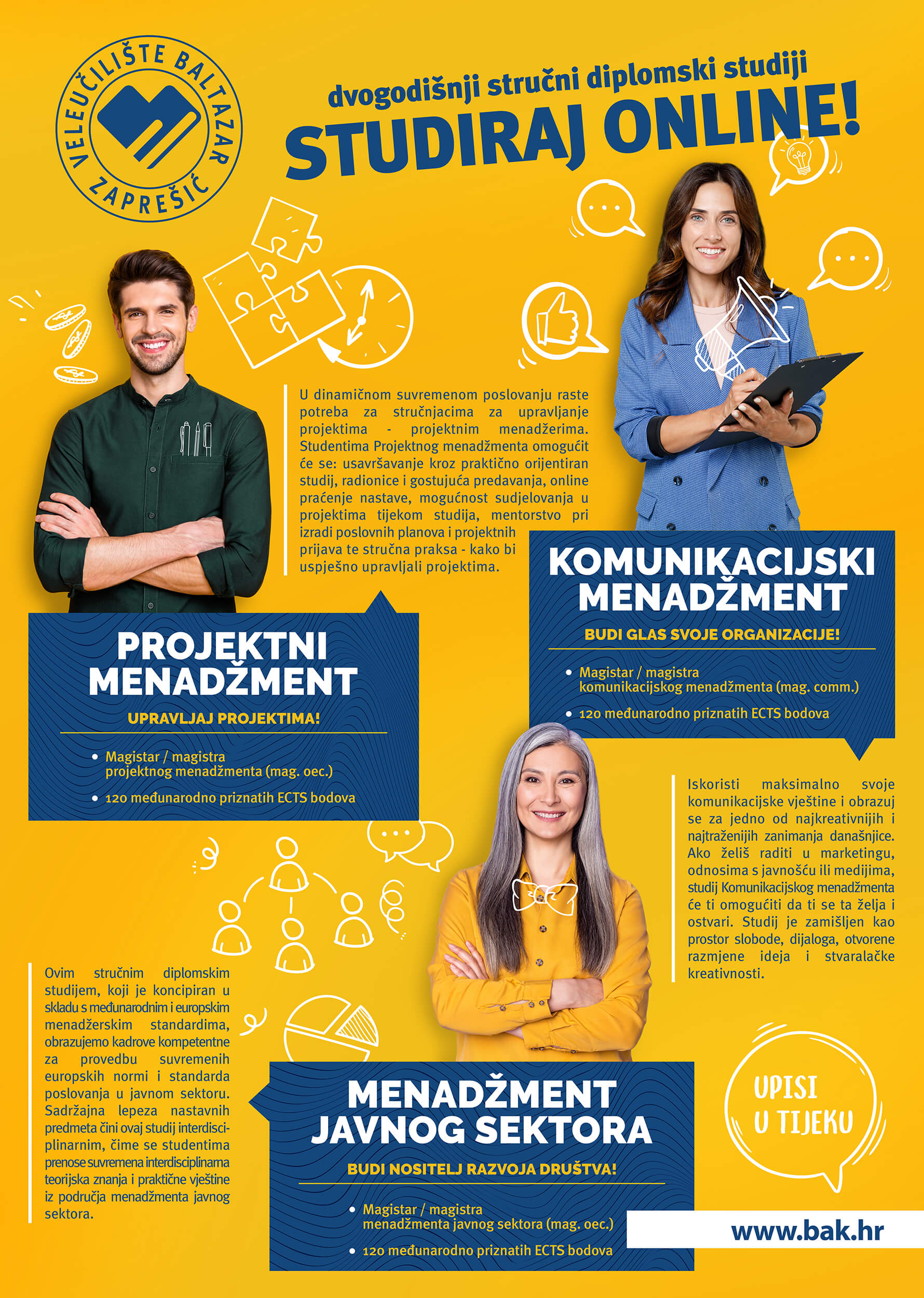 U tijeku su upisi na Veleučilište Baltazar za akademsku 2023./2024. godinu. Online studij stvara novu digitalnu generaciju studenta. Studiraj iz svojeg mjesta prebivališta ili iz bilo kojeg mjesta u svijetu.